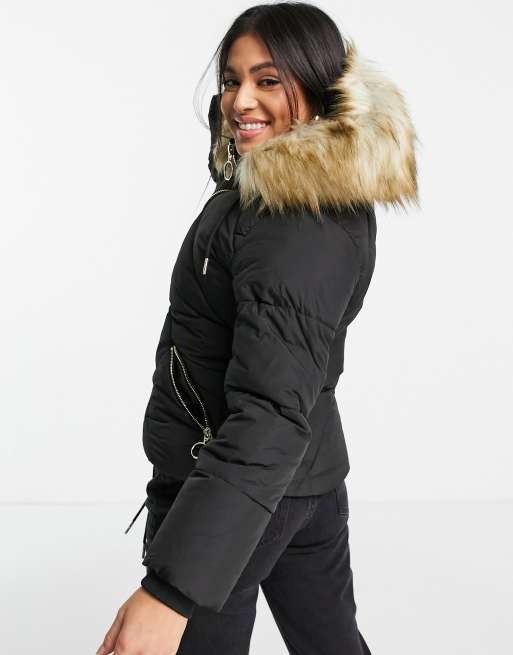 Black faux fur hood padded hot sale coat