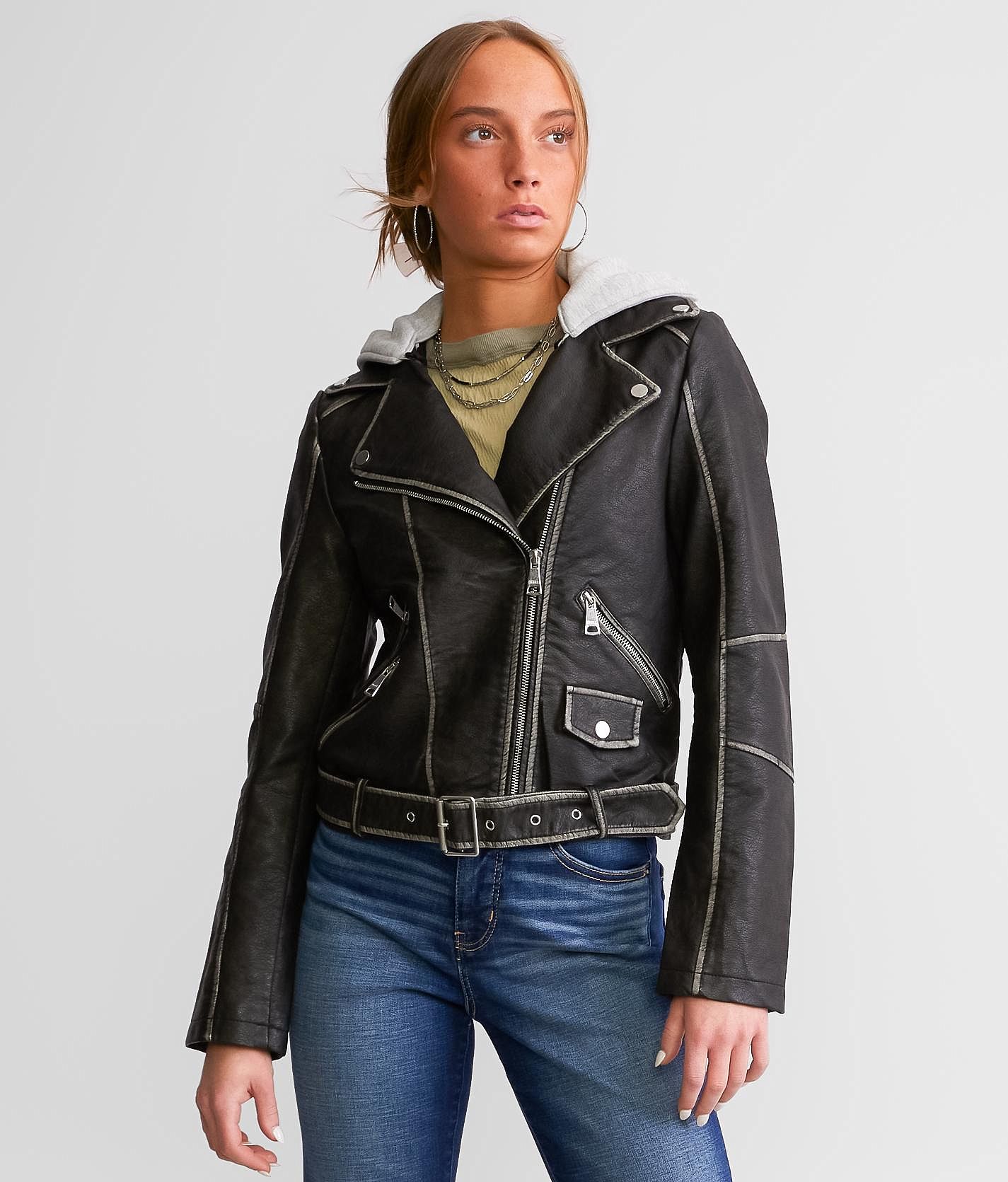 Black hooded faux leather biker hot sale jacket
