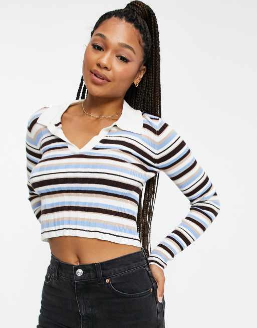 Black stripe collar polo long sleeve crop hot sale top