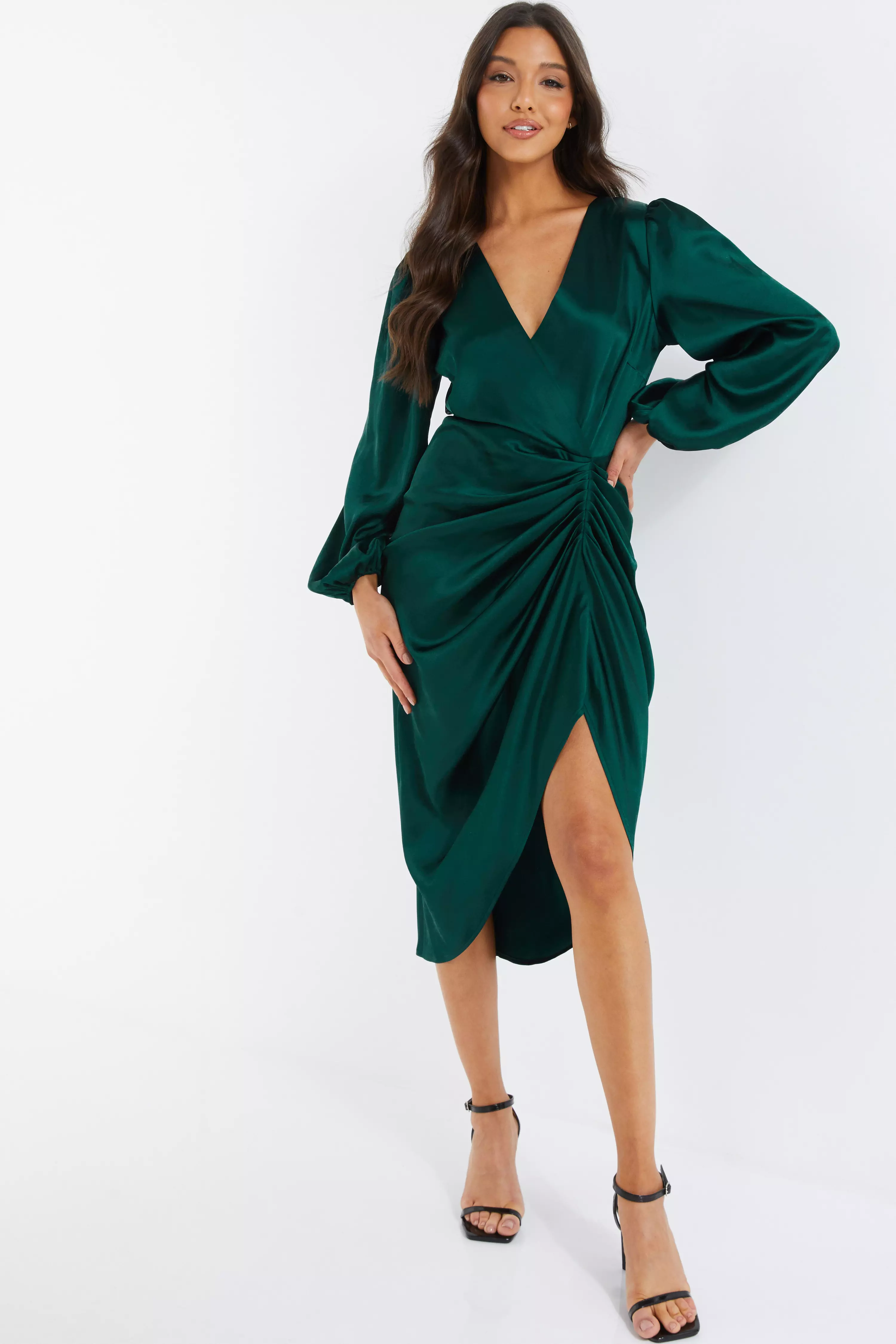 Long sleeve green satin hot sale dress