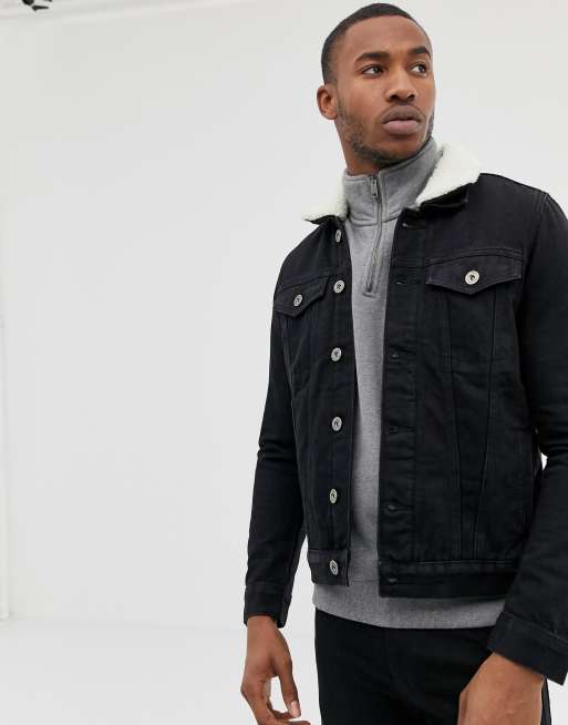 Mens black borg lined denim hot sale jacket